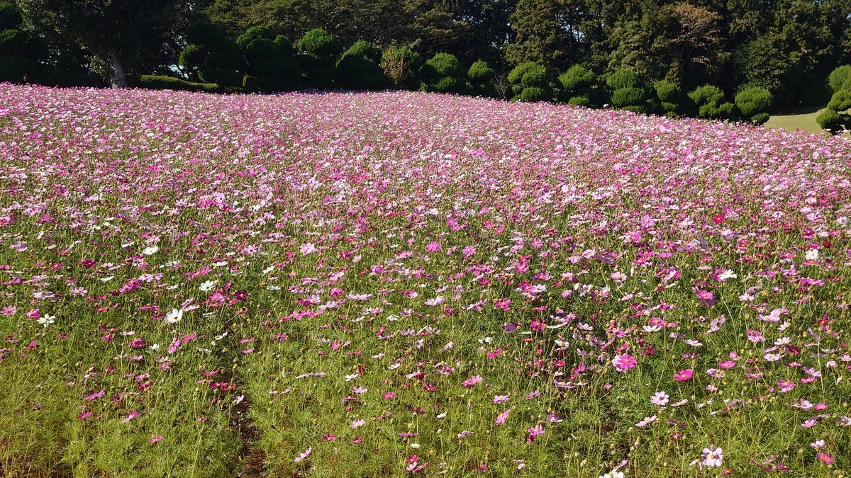 おー!一面のコスモス畑!遅咲きみたいだねー!