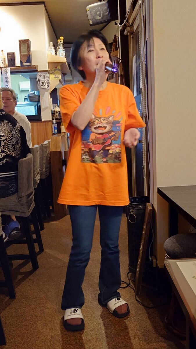 呑吉ママがさっそく「ニャン太」Tシャツを来て、カラオケ。女の子が着るとカワイイ!!!