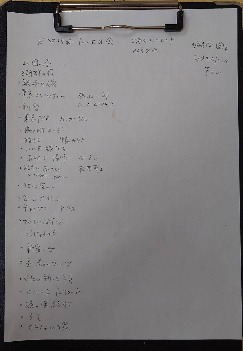 「北国の春」「星影のワルツ」(千昌夫)「わたし祈ってます」(敏いとうとハッピー&ブルー)「長崎は今日も雨だった」「中の島ブルース」「東京砂漠」(内山田洋とクール・ファイブ)「みちづれ」(牧村三枝子)「東京だョおっか母さん」(島倉千代子)「湯の町エレジー」(近江俊郎)「時代」(中島みゆき)「いい日旅立ち」(山口百恵)「白いブランコ」(ビリー・バンバン)「チャンピン」(アリス)「あの日に帰りたい」(荒井由実)白い珊瑚礁」(ズー・ニー・ブー「東京ラプソディ」(藤山一郎)「花」「荒城の月」(瀧廉太郎)「花」(喜納昌吉&チャンプルーズ)「白いブランコ」(ビリー・バンバン)「昔の名前で出ています」(小林旭)「くちなしの花」(渡哲也)「うそ」(中条きよし)「卒業写真」(荒井由実)「川の流れのように」(美空ひばり)「涙の連絡船」「好きになった人」「北の宿から」(都はるみ)「よこはま・たそがれ」(五木ひろし)「また逢う日まで」(尾崎紀世彦)などなど。